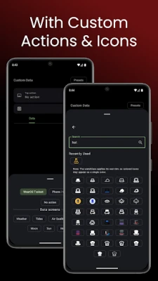 Điểm nhấn của WearOS Toolset chính là Complication Dữ Liệu Tùy Chỉnh – tính năng mà bạn đã chờ đợi bấy lâu. Không còn gói gọn trong một mẩu thông tin, bạn có thể kết hợp gần như mọi giá trị mong muốn: hiển thị nhiệt độ hiện tại, văn bản tùy chỉnh và chiều cao thủy triều, tất cả trong cùng một ô duy nhất. Toàn quyền kiểm soát hành động khi chạm, từ việc khởi chạy bất kỳ ứng dụng, phím tắt nào cho đến các hoạt động cụ thể trong ứng dụng. Hàng ngàn biểu tượng từ thư viện Iconify đang chờ bạn lựa chọn, giúp bạn thể hiện cá tính riêng một cách hoàn hảo.